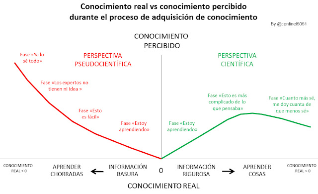 Si las fuentes de información son fiables y rigurosas, el conocimiento sobre un tema irá aumentando progresivamente. Las personas aprenderán de verdad y se darán cuenta que, casi siempre, todo es más complejo de lo que parece. Si, en cambio, la información es falsa o incorrecta, como por ejemplo ocurre en el ámbito de las pseudociencias o en buena parte del mundillo alternativo, y no existe una actitud escéptica, el conocimiento puede ir degenerando. Y nos encontraremos con gente que, cuanta más información basura recibe, más se aleja de la realidad objetiva, pero paradójicamente, más cree que sabe.